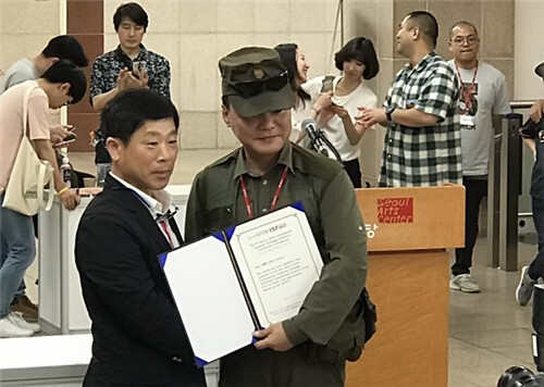Han Jin Sub, president of Korea Sculptor’s Association awarded certificate to artist Long Xiang